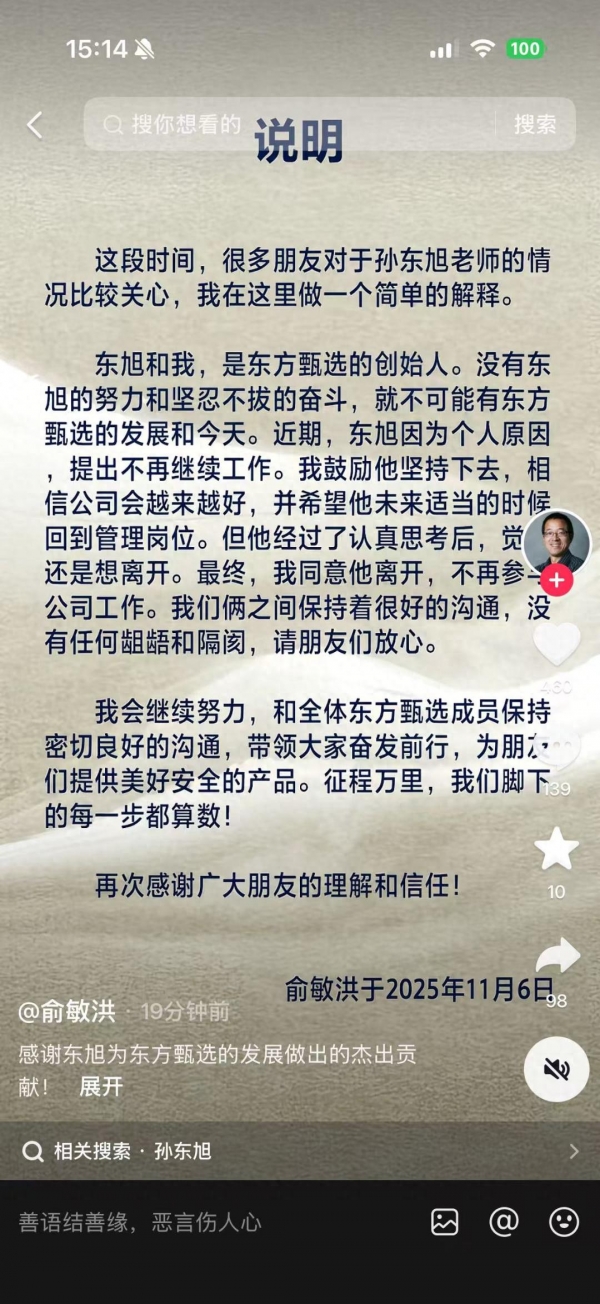 6日下午,新东方创始人俞敏洪在社交平台发文:这段时间,很多朋友对于孙东旭老师的情况比较关心,我在这里做一个简单的解释。东旭和我,是东方甄选的创始人。没有东旭的努力和坚忍不拔的奋斗,就不可能有东方甄选的发展和今天。近期,东旭因为个人原因,提出不再继续工作。我鼓励他坚持下去,相信公司会越来越好,并希望他未来适当的时候回到管理岗位。但他经过了认真思考后,觉得还是想离开。最终,我同意他离开,不再参与公司工作。我们俩之间保持着很好的沟通,没有任何龃龉和隔阂,请朋友们放心。我会继续努力,和全体东方甄选成员保持密切良好的沟通,带领大家奋发前行,为朋友们提供美好安全的产品。