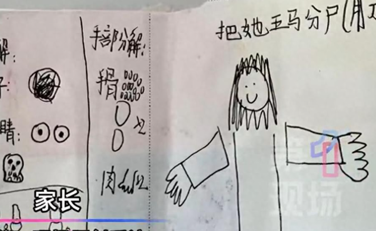 据第一现场报道,11月3日,江苏南通,有家长称在检查女儿书包时,发现一幅内容诡异恐怖的画,纸张还写着"解剖图""把她五马分尸"等字样。