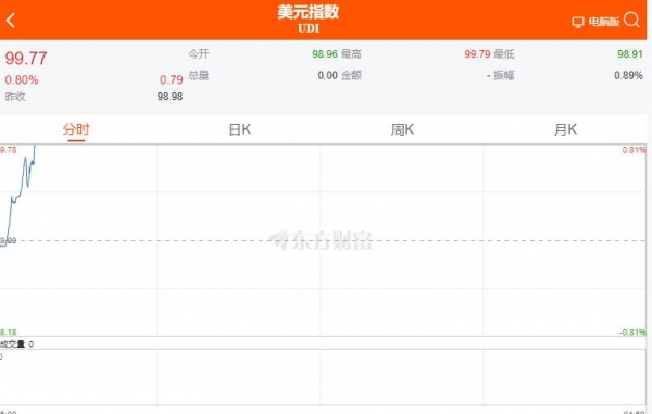 4月23日开盘,美元指数上涨近100点,涨幅0.68%,现报99.77。