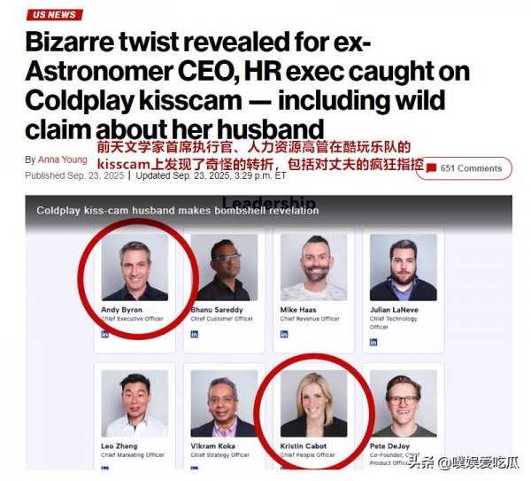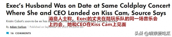 7月16日晚,在美国波士顿一场Coldplay酷玩乐团的演唱会上,科技公司Astronomer CEO安迪·拜伦与他的首席人事官克里斯汀·卡伯特因主唱克里斯·马汀(Chris Martin)玩起了"Kiss Cam"(起源于体育赛事中的观众互动游戏,通过镜头随机捕捉观众席中的情侣或同伴,并期待他们在镜头前互亲以活跃现场气氛。)被拍到时因紧张躲避受到关注。