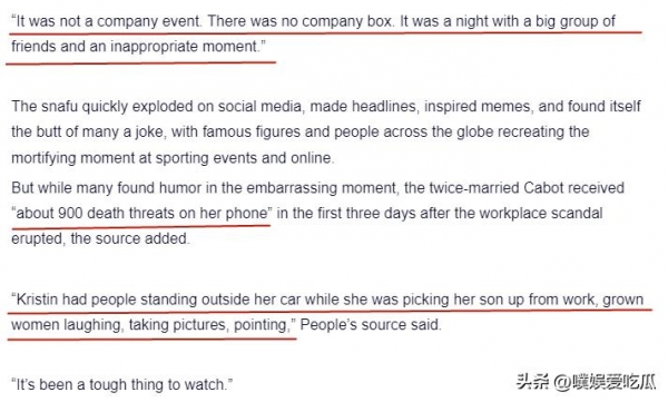 该友人对克里斯汀和安迪·拜伦因"出轨门"一事被停职后又各自离职抱不平,称"克里斯汀和安迪有着绝佳的工作关系和深厚的友谊,不存在婚外情",并表示"在演唱会上拥抱你的老板是不妥当的,她对此承担全部责任。但由此引发的丑闻、事业的崩塌、工作的丢失--所有这些都是不公平的。"这名知情人士透露,克里斯汀对事件演变成全球新闻感到难以置信。丑闻爆发后的头三天里,克里斯汀"在她的手机上收到了约900个死亡威胁"。就连她去接孩子,也受到别人的指指点点。