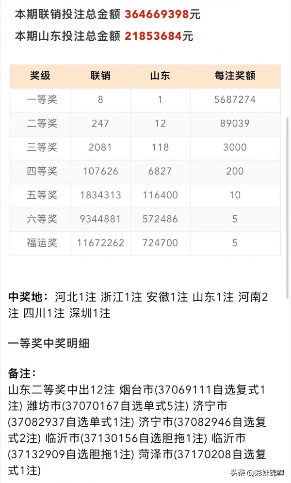 从开奖公告中,我们可以看出本期的开奖情况。一等奖本期开 8注,每注奖金568 万,一等奖出自河北1注,浙江1注,安徽1注,山东1注,河南2注,四川1注,深圳1注, 。开奖后奖池28.1 亿 ,本期二等奖开出了 247注,每注奖金8.9 万 。本期山东省一等奖 1注。以下是山东省的中奖情况!