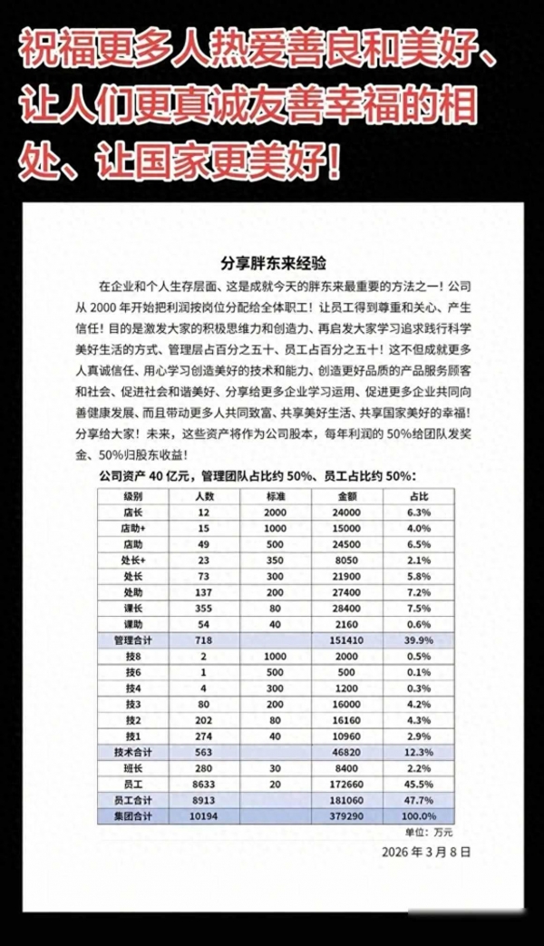 3月8号那天,河南许昌一家叫胖东来的超市老板于东来发了条朋友圈,说公司把去年赚的40亿净利润全都分给了1万1千名员工,钱已经打到大家的账户里,不是随便说说就算了的,12个店长每人拿到2000万,500多个技术骨干加起来分走了4亿多,剩下8000多名员工平均每人也收到20万左右。