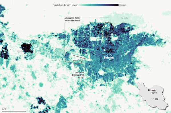 德黑兰人口密度示意图。德黑兰市区人口密度和纽约相当,资源紧张。《纽约时报》