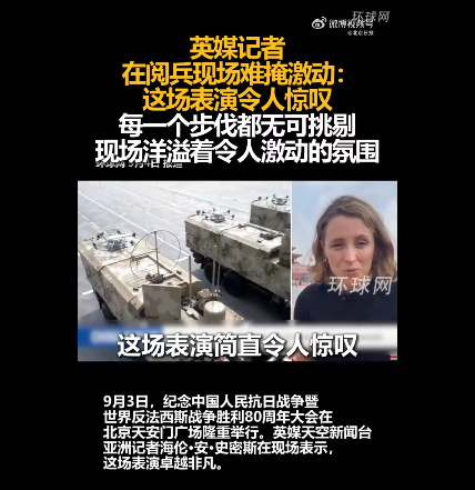 英媒天空新闻台亚洲记者海伦·安·史密斯:这场表演简直令人惊叹,那份精准度、那份准确度,每一个步伐都无可挑剔,在我们所在的看台上,每一次头部的转动都能真切感受到坦克驶过,战机掠过上空时带来的震撼冲击,现场洋溢着一种令人激动的期待氛围,周围的观众都是普通民众,他们就站在我们座位前方的区域,这真是一场无与伦比的精彩展演。
