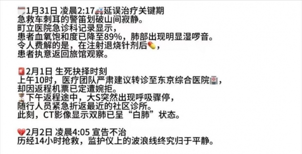 可注射退烧针后,患者执意返回旅馆观察。2月1日上午10时,医疗团队建议转院,但因返程机票已定遭婉拒。后面就是在去往机场的路上,大S出现呼吸骤停,紧急折返最近的社区诊所。