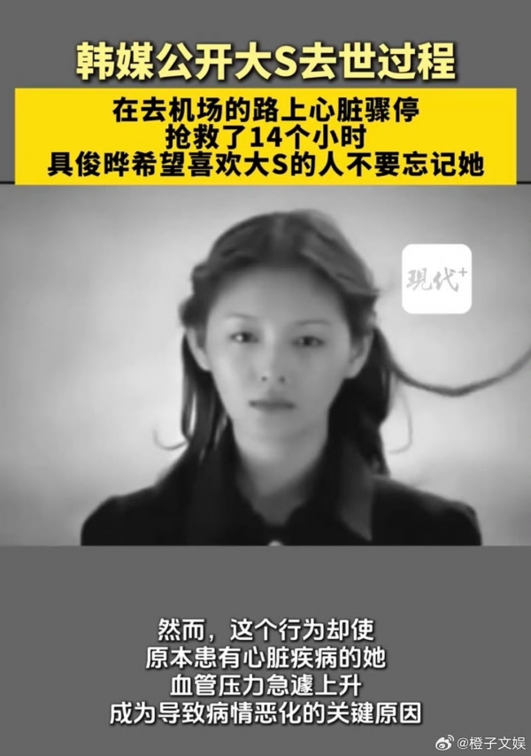 韩媒公开大S去世过程,有一个细节就是在去机场的路上,大S心脏骤停。被接到附近的社区医院,抢救了14个小时。
