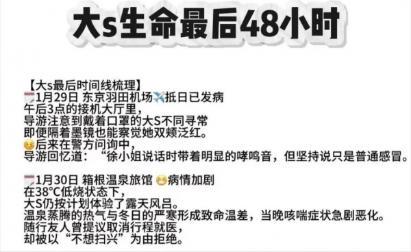 1月30日,抵达箱根温泉旅馆,此时病情已经加剧。38度的低烧状态下,大S依然按照轩计划体验露天风吕,温泉蒸腾的热气与冬日严寒形成致命温差,当晚哮喘症状急剧恶化。