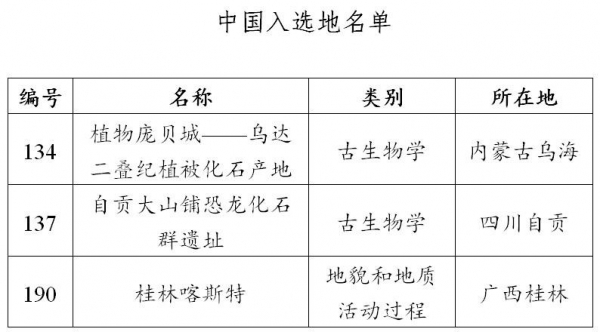 近日,在韩国釜山召开的第37届国际地质大会上,国际地质科学联合会(以下简称"国际地科联")公布了全球第二批100个地质遗产地名录,中国有三地入选,分别是《植物庞贝城--乌达二叠纪植被化石产地》(内蒙古)、《自贡大山铺恐龙化石群遗址》(四川)和《桂林喀斯特》(广西),涉及古生物学、地貌和地质活动过程等领域。