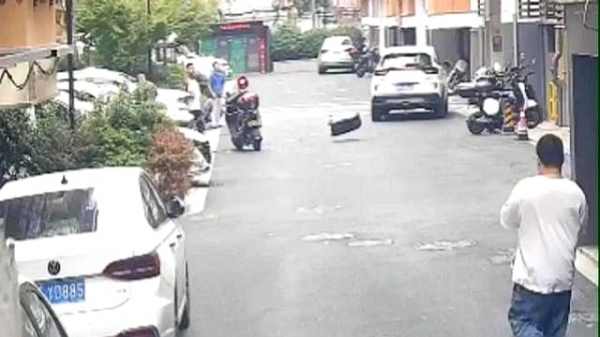 行李箱落点离花坛砖边只差两指,泥土被砸得溅起一圈,路面碎了一块,底楼电瓶车都被震得报警器尖叫,周围住户抓紧拉小孩回屋,谁都说不准是不是还会再扔。