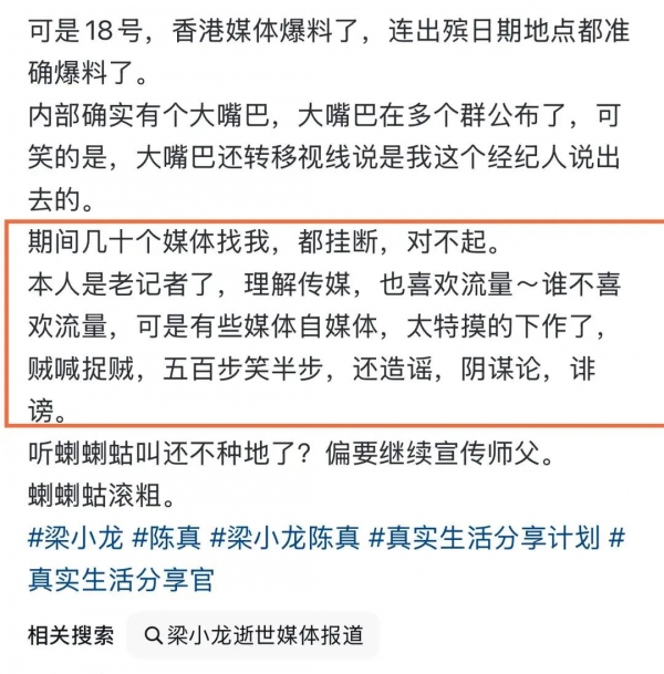 然而这份浪漫约定,终究被"内鬼"打破。1月18日,香港媒体突然曝光死讯,连1月26日在深圳龙岗举行出殡仪式的细节都精准泄露。经纪人直言寒心,透露消息源自内部人员在私密群组的散布,甚至有人刻意将矛盾指向经纪团队,无奈之下只能提前公开真相。