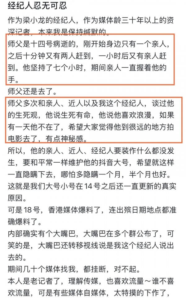 经纪人在长文中还原了梁小龙生命最后的7小时,细节令人动容。1月14日凌晨2点半,梁小龙在家中突发疾病,胸口剧痛到面青口唇白,彼时身边仅有一位亲人陪伴--据推测大概率是相伴30年的小20岁妻子宋骧。十分钟后,两位家人紧急赶到,一小时内所有至亲陆续齐聚病床前。"他一直紧紧抓着亲人的手,顽强地撑了7个小时",经纪人透露,从突发急症到安详离世,梁小龙始终在等待亲人团聚,这份对世间的眷恋让在场者无不动容。