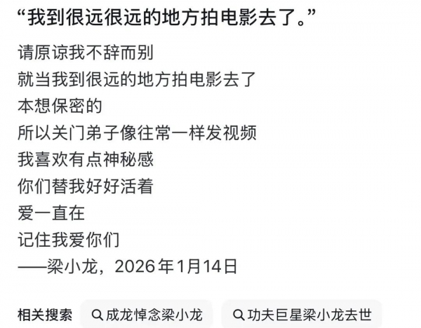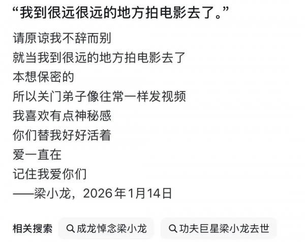 这位在银幕上以刚劲凌厉功夫著称的硬汉,私下里却有着孩童般的浪漫情怀。经纪人透露,梁小龙曾多次与家人、团队谈及身后事,笑着说"希望离开时能留点神秘感,就当我去很远的地方拍电影了"。为了实现这份遗愿,家属与团队强忍悲痛,默契地选择暂时隐瞒死讯,按照原计划持续更新社交账号,甚至准备至少隐瞒半个月。1月17日账号发布的呼吁关注拐卖儿童的视频,正是团队提前备好的库存,字里行间的恳切与生前无异,这份小心翼翼的守护,让梁小龙以另一种方式留在了观众身边。