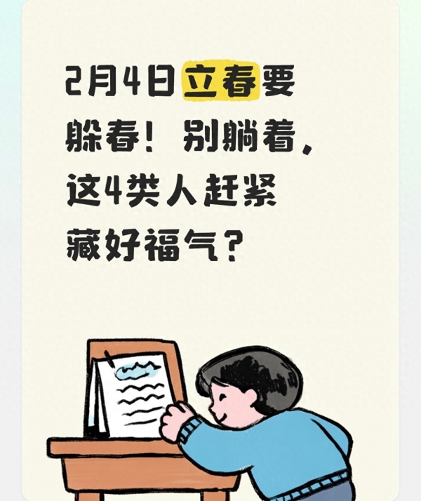 2026年的立春节气落在2月4日上午9时15分,农历腊月十七,作为二十四节气之首,立春不仅是冬去春来、万物复苏的自然节点,更是中国人心中辞旧迎新、迎接新生的重要时刻。民间流传千年的"躲春"习俗,并非坊间所说的封建迷信,而是老祖宗根据自然节律和生活智慧总结的处世之道,是人们对新一年顺遂平安的美好期许。老话讲"立春躲春,不躺床,藏好福气一年旺",这其中的讲究,藏着顺应天时、调整自身的生活哲学,尤其是今年丙午马年,有四类人更适合借着躲春的仪式,为新一年积蓄能量、藏好福气,而"不躺床"的核心,更是契合了春日阳气生发的自然规律,值得我们好好了解和践行。