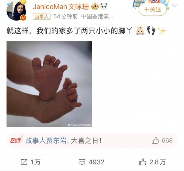 初次当妈的文咏珊无比激动,简单的话语透露出浓浓的母爱:就这样,我们的家多了两只小小的脚丫。