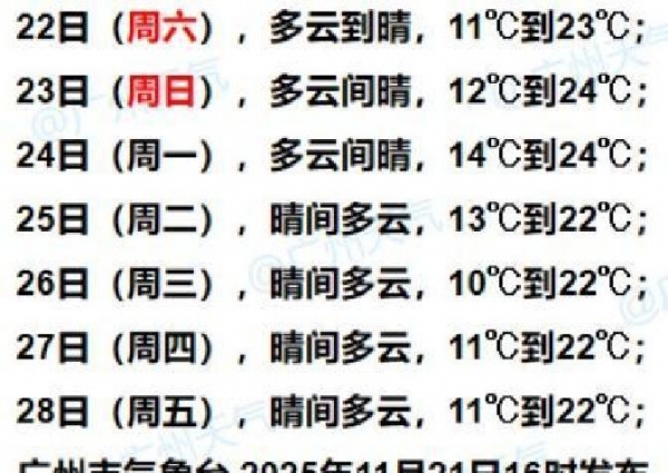 接下来几天广东省的天气安排基本是这样的:22号到24号,大部分地方以晴天为主,空气偏干,白天温度慢慢往上走,可昼夜温差比较大,早晚还能感到凉。分地方讲,22号北部跟珠三角北部最低温大概在6到9度,高山上会更低;沿海南边最低大概13到16度,其他地方在10到13度之间。23号普遍也是晴,北部最低大约7到10度,沿海14到17度,中间地带11到14度。24号北部、西部和珠三角西侧会从多云慢慢转晴,北部最低在9到12度,粤西15到19度,别的地方12到15度。广州这边这一周继续偏干,白天热、早晚冷的节奏挺明显;从24号夜里开始会有一股新的弱冷空气过去,气温会小幅回落,不过幅度不会太大。