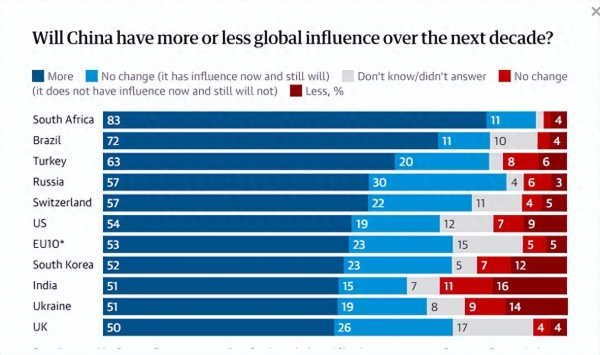 在所有受访国家中,认为中国影响力将上升的比例全部超过50%。南非高达83%,巴西72%,土耳其63%,俄罗斯、瑞士都是57%,就连美国,也有54%的人作出同样判断。欧盟整体为53%,印度51%,英国最低,但也有50%。