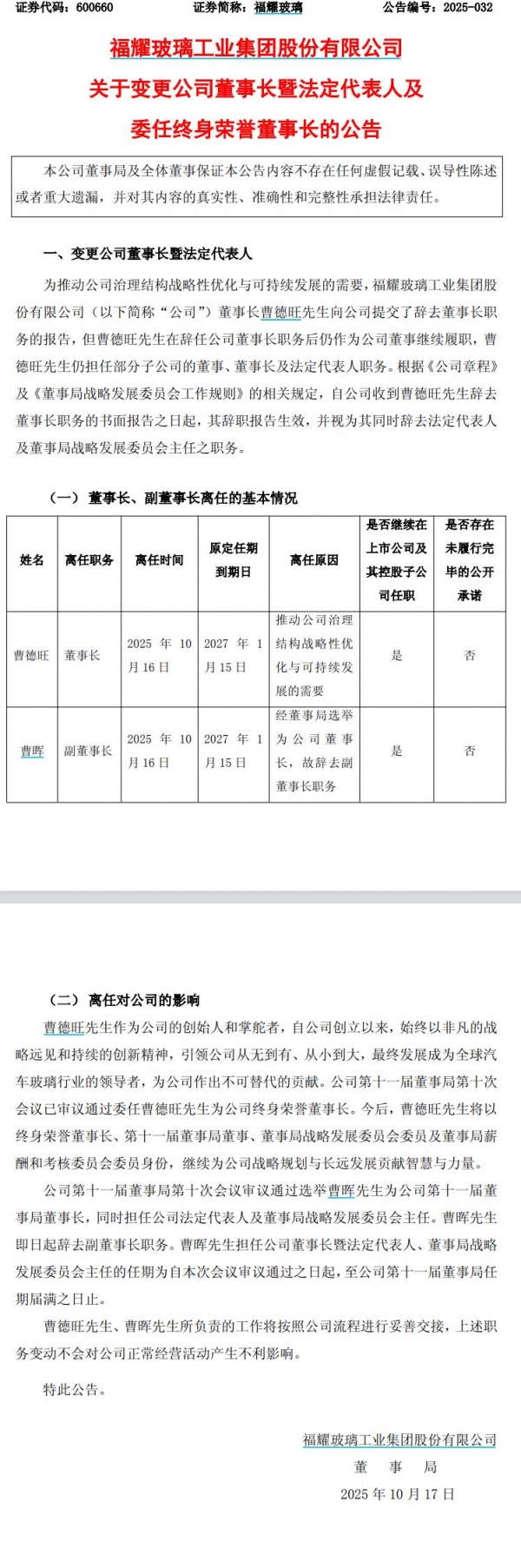 同时,公司选举曹晖为新任董事长,并任命其为法定代表人及董事局战略发展委员会主任。曹德旺被委任为公司终身荣誉董事长。