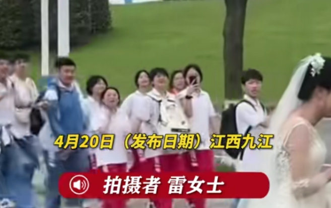 4月17日,江西九江。摄影师在拍摄婚纱照时,遇到了一群正在春游的学生,大概是100多人,好几个班在一起。他们看到就齐声高喊"新娘,你好漂亮""新婚快乐"。学生们特别有活力,"百子送福"很有意思。