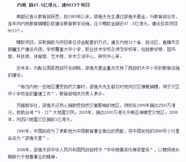 内地很多大学都有以他名字命名的教学楼,据统计他对内地教育事业的捐款超过100亿港元。