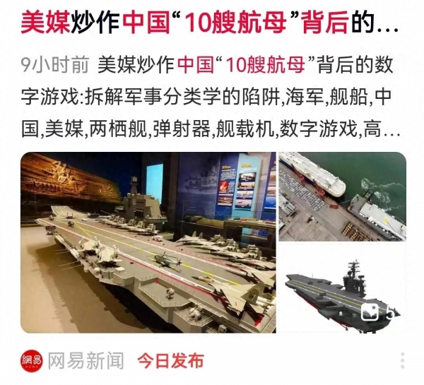 实际上,中国海军目前公开的航母只有3艘,包括刚刚服役的福建舰。美媒所谓的"10艘航母",竟是偷换概念,将4艘075型两栖攻击舰和尚未建成的076型等都算了进去。例如,福建舰被其称为"第7艘航母",而刚海试的076型首舰四川舰,则被强行冠上"第八航母"之名。