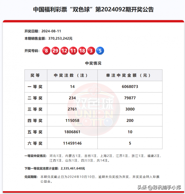 本期双色球全国开出一等奖14注,单注奖金606万元。二等奖234注,单注奖金7.9万余元。