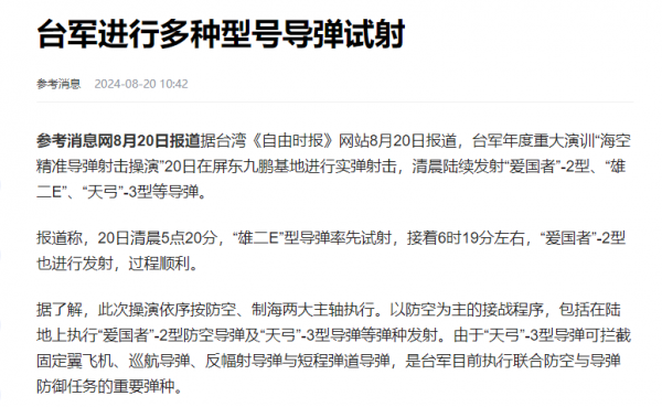 【台军组织"海空精准飞弹射击操演"报道】