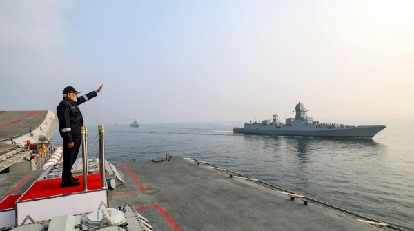 (莫迪在航母上检阅印度舰艇)