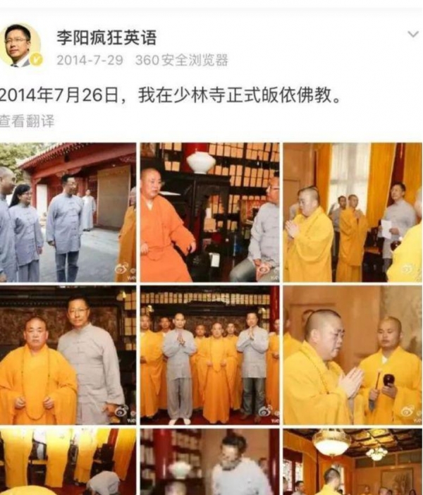 这五个人里,三个人是释永信曾经的徒弟,一个是少林寺僧徒叫释延云,一个现在是著名导演傅华阳,但恐怕大家最耳熟能详的,还得数疯狂英语李阳。