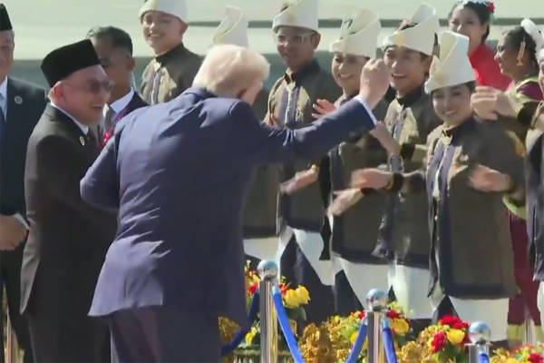 当地时间10月26日,飞抵马来西亚首都吉隆坡的特朗普,在机场手舞足蹈。 视频截图