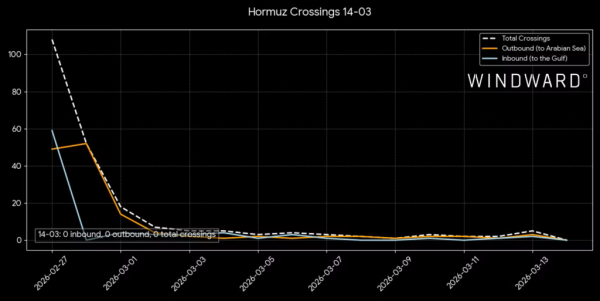 海事数据分析服务公司"迎风公司"3月15日发布数据称,3月14日,霍尔木兹海峡双向通行量降至零,无船舶自动识别系统(AIS)信息可确认船只通过,较前一日下降100%,低于日均2.57艘的7日均值。