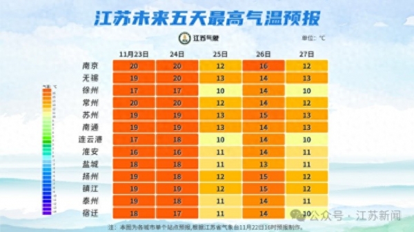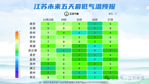 25日,受新一股冷空气影响,全省降温明显,24日南京最高温还有20℃,到了25日仅12℃,直降8℃!到26号全省大部分地区最低气温将重回1℃上下。