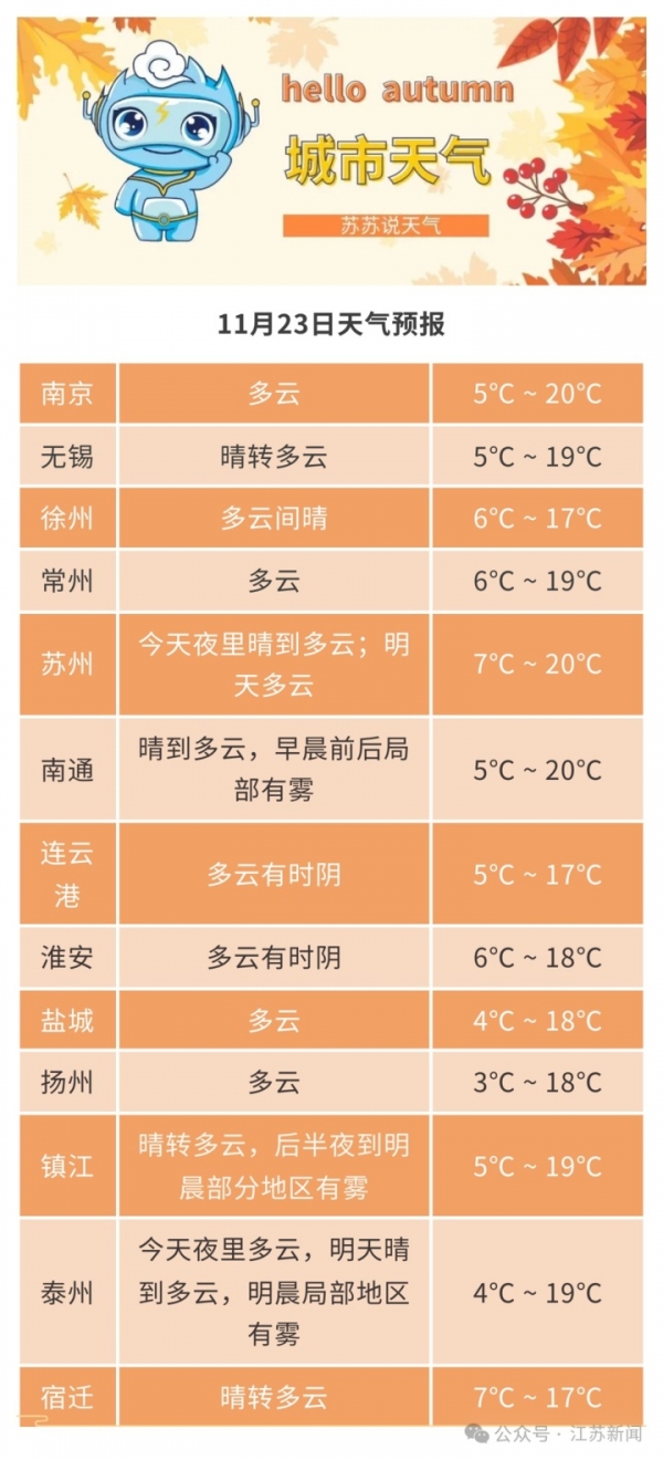 全省多云到晴。最高温度:沿江和苏南地区18~19℃,其他地区16~17℃;最低温度:沿淮和淮北地区4~5℃,本省东南部地区8~9℃,其他地区7℃左右。全省偏西风3-4级转西北风4-5级阵风6级。