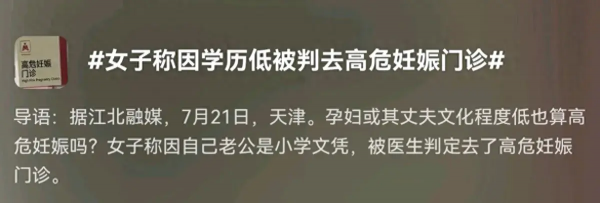 近日,一女子发视频称,自己和丈夫因文化太低,而被医生判定去高危妊娠门诊,这一视频在微博也成了热搜话题。