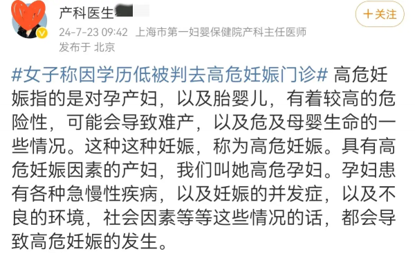高危,指的是妊娠背后的隐患,不是妊娠这件事,很多孕妇和家属文化学历低,沟通困难,服从性低,有时候甚至会自己乱做主张,医生在面对这些孕妇时,比平常普通孕妇还要高度重视,所以,看似"歧视"其实是为了孕妇的安全。