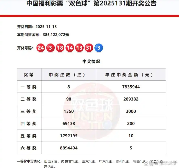 2025年11月13日,双色球第2025131期开奖结果揭晓,本期全国总销售额达3.85亿元。开奖后,奖池资金依然维持在27.99亿元的高位,持续为彩市注入活力。