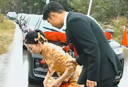 画面里,新娘身着中式礼服,新郎西装笔挺,两人在婚车队列中缓缓下车。脚下是刚下过雨的湿滑路面,周围是寂静的树林,空气里仿佛都弥漫着不舍的情绪。新娘整理好裙摆,和新郎一同屈膝跪地,朝着父亲坟地方向,郑重地行下叩拜之礼。