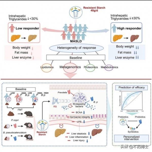 通过每天补充40克抗性淀粉、持续4个月后,约有70%的参与者成为"高反应者",肝内脂肪平均下降57.7%,体重、肝酶、胰岛素敏感性等多项指标大幅改善;另外30%的"低反应者",肝脏脂肪仅下降7.1%,其他指标改善微乎其微。