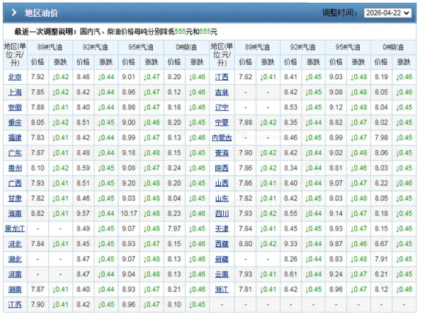 不过,此番油价高歌猛进后,随着原油市场降温,短期内,WTI原油从112.94美元降至83.85美元/桶,上一次调整,国内汽柴油重新下降,汽油下降555元/吨,柴油下降530元/吨,主流92/95号汽油下降0.44~0.48元/升!此番油价下降,这也抹去了4月上旬的涨幅,国内油价重心回落,倘若,上轮周期末原油市场继续回落,理性来看,今年第9次调价,国内汽柴油存在"2连降"的机会……