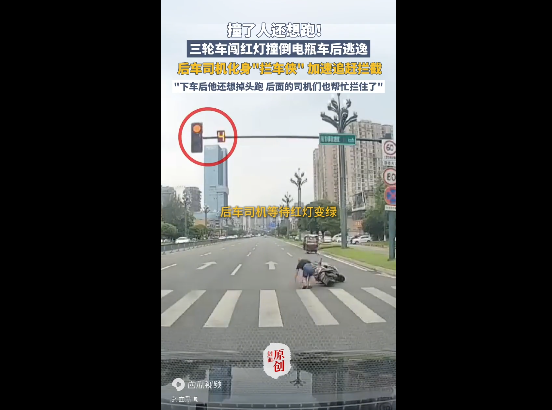 而这一幕,恰巧被正在路口等红灯的一辆小车车主亲眼目睹,车主随即化身"拦车侠",在等待红灯变绿灯过后,一个加速,上前把三轮车拦下。这段紧张又充满正义感的一幕,被车辆的行车记录仪完整记录了下来。8月18日,记者联系到视频中的"拦车侠"唐先生。他告诉记者,事情发生在成都新都区七一广场附近,当天选择加速拦下三轮车,是因为不想看到这样的肇事者逃逸,也考虑过可能出现的后果,"没得事,我有保险,作为该出手时就出手!"