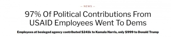 OpenSecrets网站收集的数据显示,2024年美国大选期间,USAID员工几乎将所有政治捐款投向民主党候选人哈里斯,金额高达24万美元,而捐给特朗普的只有999美元。这一政治倾向的失衡进一步加剧了特朗普政府对该机构的不信任。