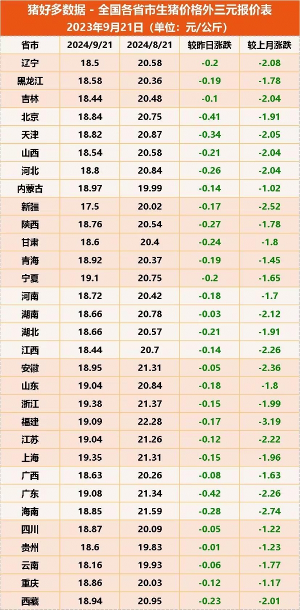 从目前情况来看,猪价从8月16号的最高点21.25元/公斤,用一个月的时间跌至今天的18.79元/公斤,跌幅为2.46元/公斤,相当于养猪利润蒸发了超300元/头!
