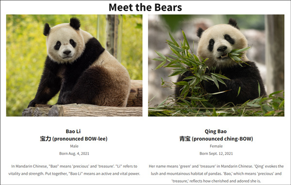 华盛顿国家动物园网站对两只熊猫名字的中文含义进行了解释:在汉语中,"宝"的意思是珍贵和财富,"力"指的是活力和力量,合起来意思是积极向上、充满活力。"青宝"的名字在汉语中意为"绿色"和"宝藏","青"让人联想到大熊猫的山地栖息地,"宝"意为珍贵和宝藏,反映了她是多么受人珍惜和喜爱。