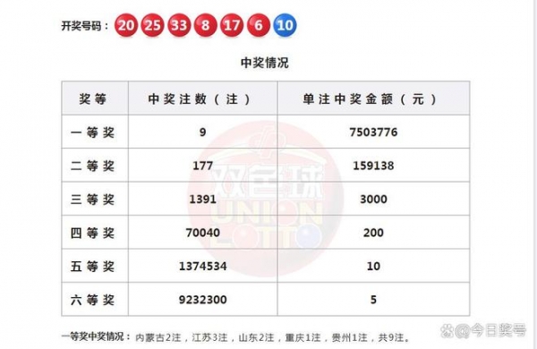 本期为双色球的第2025117期开奖,本期销售金额:389,301,568元,本期开奖号码诶06 08 17 20 25 33+10,本期的双色球红球方面开出了一个掉号08,而且这个08已经是三连掉了,本期没有同尾数的号码,同样也没有连号,蓝号方面开出了间隔2期的号码10 ,那么开出这样的号码组合全国彩民中奖情况如何了?