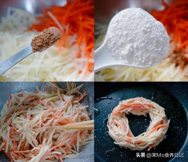 1、先把土豆和胡萝卜的皮削掉,用擦子擦成丝,放进大碗里。撒上盐和五香粉,再把面粉倒进去,拿筷子使劲搅拌搅拌,让它们好好 "抱成团"。