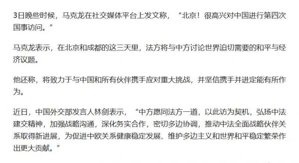 并且还对接下来的日程表达了期待,称"在北京和成都的这3天,中法将讨论和平与经济议题,并且相信跟中国携手并进,定能有所作为。"