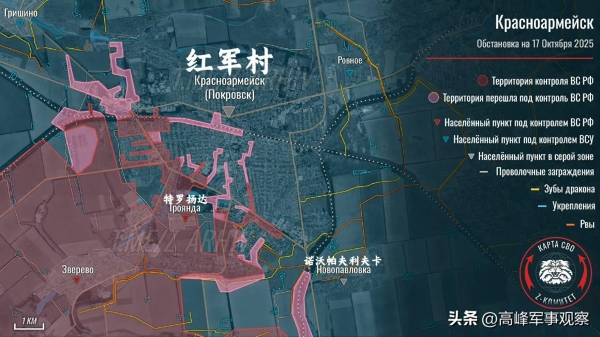 第二件事儿是,乌克兰军队在三大军事要塞的防御正在加速崩溃。10月17日,库皮扬斯克已经有80%的市区面积被俄军控制。在康斯坦丁诺夫卡(顿河君士坦丁诺夫卡),俄军攻入城市东部圣图里诺夫卡微区,在这座城市首次打响巷战。在红军城,在空地火力支援下,俄军地面部队首次攻抵市中心地带。数千发炮弹打击过后,不计其数的俄军无人机开始搜剿乌军残存作战人员。心如死灰的乌军残兵跪地举白旗向俄罗斯无人机投降。
