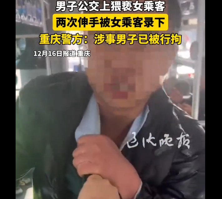 12月16日重庆市万州区公安局发布通报,近日网传一女子坐公交被猥亵,我局已于案发当日11月20日依法处理完毕,当天13时许,田某(男,23岁)在万州区周家坝乘坐公交车时故意触碰一名女乘客臀部实施猥亵,受害人当场报警,经调查后,我局依法对田某处以行政拘留处罚并已执行。