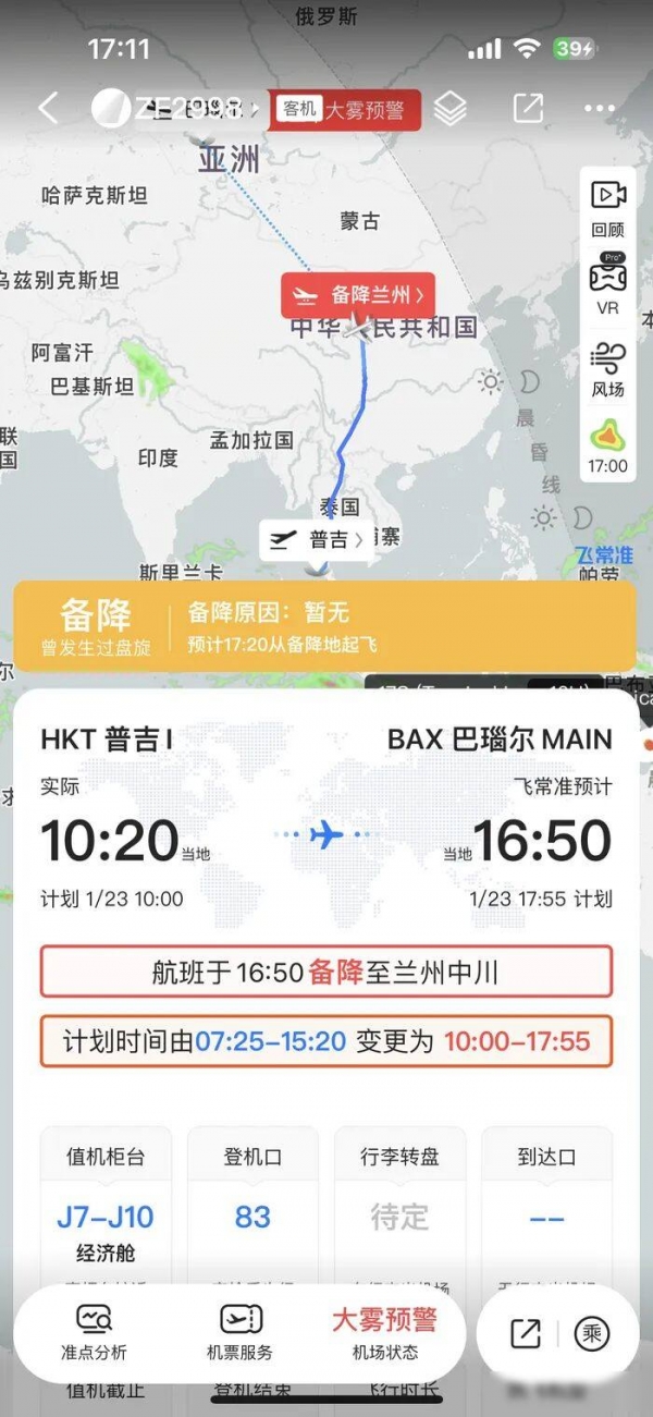 航班记录显示,这趟从泰国普吉岛飞往俄罗斯巴瑙尔的飞机,上午十点二十一分起飞后,快到中国领空时出了状况,下午三点左右,兰州机场的人说,飞机在天上绕圈放油,准备落地,直到傍晚才慢慢降下来,期间没影响别的航班起降。