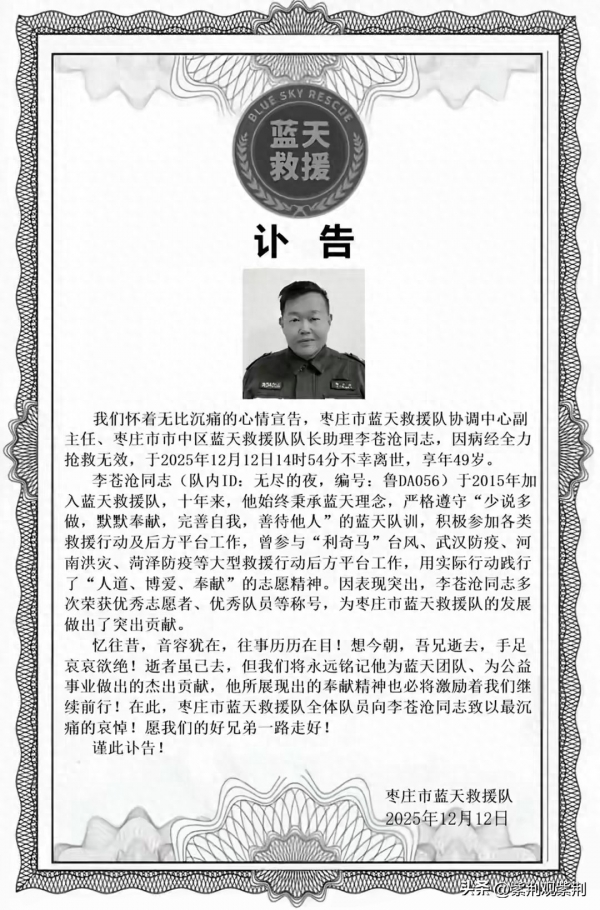李苍沧2015年加入蓝天救援队,队内编号鲁DAO56,是枣庄协调中心副主任、市中区队队长助理。十年里他没冲在救援一线,专做后方平台保障,利奇马台风时守着电话接求助,河南洪灾时熬夜统计物资,武汉防疫时组织志愿者排班,拿过好几次"优秀队员"。他自己开了家小铺子,常跑济南枣庄两地,视频号简介就五个字"普通救援志愿者",最后一条动态停在11月13日,说"走过的路全是回忆,无怨无悔",配的全是救援现场的照片。